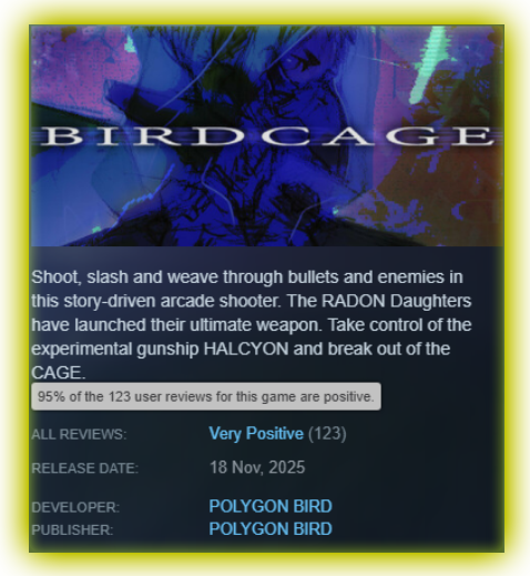 Shoot, slash and weave through bullets and enemies in this story-driven arcade shooter. The RADON Daughters have launched their ultimate weapon. Take control of the experimental gunship HALCYON and break out of the CAGE.